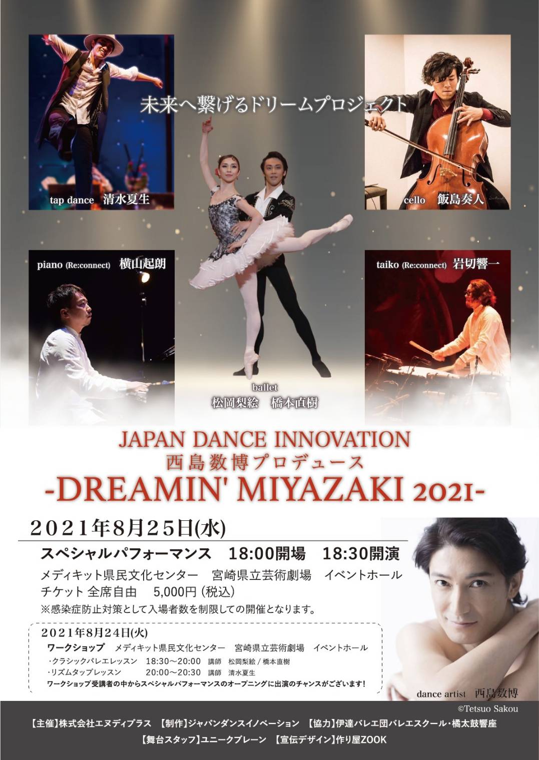 今回の「DREAMIN’ MIYAZAKI 2021」は地元宮崎の「みやざき大使」でもある主催の西島数博が、宮崎県の舞台芸術の発展と向上に貢献したいと企画されたものです。